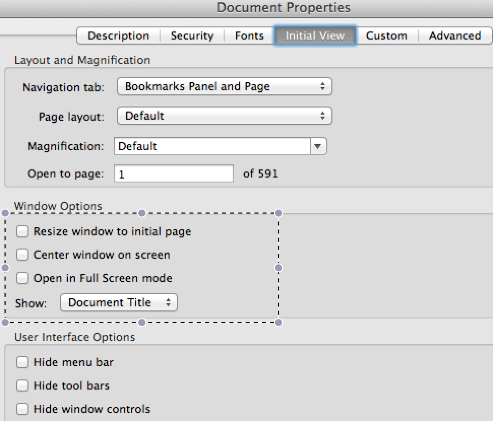 I have installed RenderX XEP 4.3 and I am able to render fo files to PDF without any issues directly or with DITA-OT1.8.5. But now I need to generate 508 compliant PDFs and would like to know if there is an option to set the PDF Document title so that when the PDF is opened the title bar shows the document title. The option can be found in Acrobat Pro->File->Properties->Initial View as shown in the attached image.